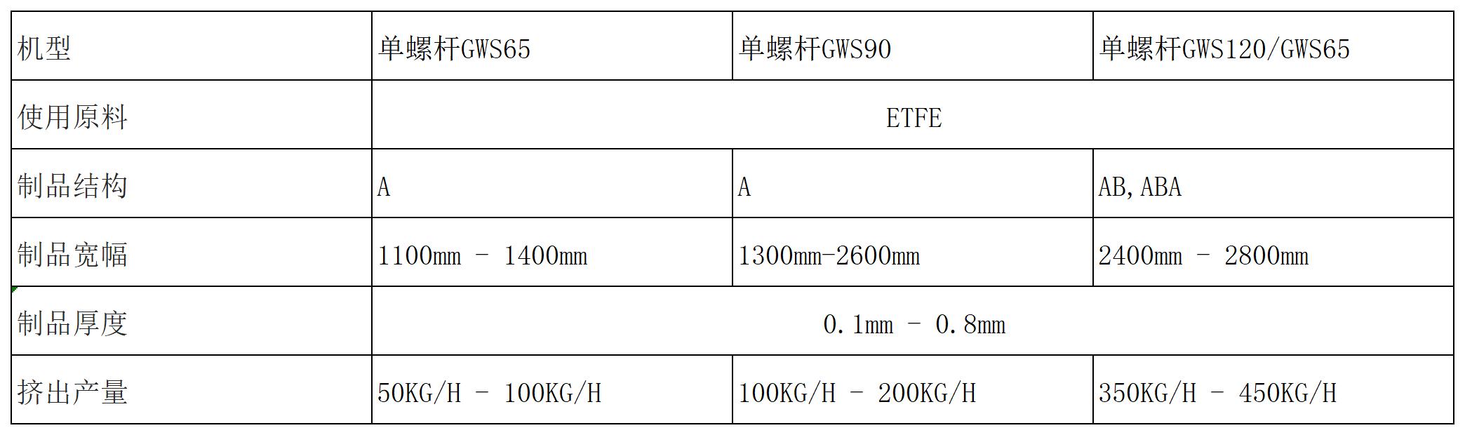 ETFE薄膜是含氟塑料中的其中之一,具有良好的ETFE膜透光率、自潔性、絕緣性能、抗?jié)駸岷湍屠匣阅芏粡V泛應用在各個領(lǐng)域。ETFE氟塑料膜由于含有氟元素,在熱加工時容易發(fā)生熱分解,腐蝕加工設備和模具,因此,加工設備和工藝不同于普通的熱塑性塑料。本生產(chǎn)線采用特殊設計的設備和工藝技術(shù),成功開發(fā)出了ETFE等氟塑料薄膜的流延擠出生產(chǎn)線。